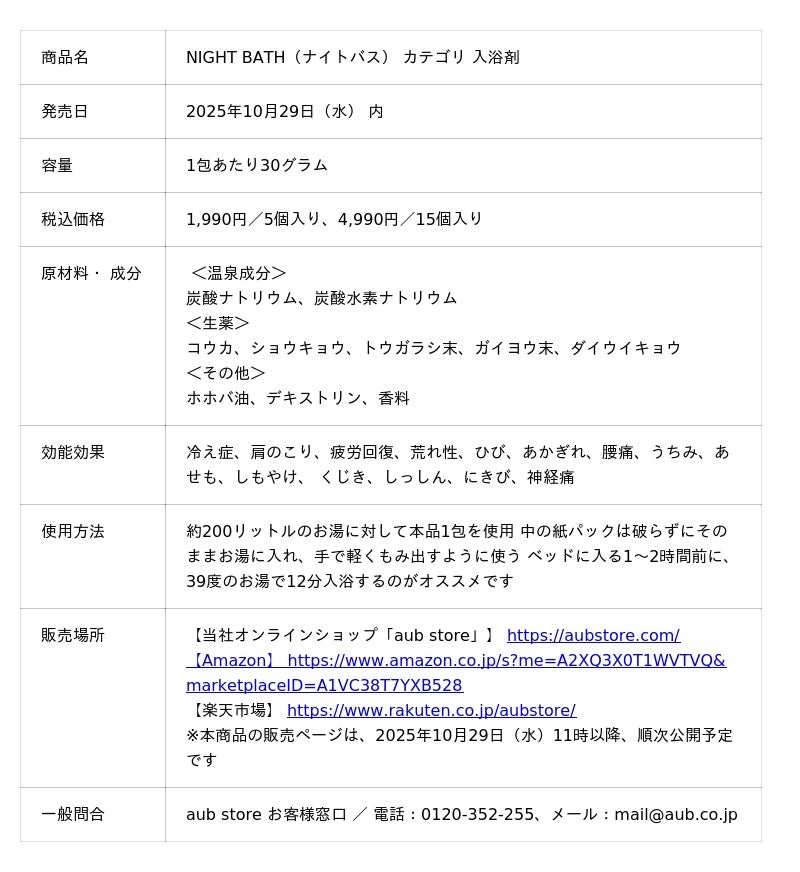 腸内細菌を研究する「AuB(オーブ)(株)」(東京)は、疲労回復効果のある入浴剤「NIGHT BATH(ナイトバス)」を新発売します。