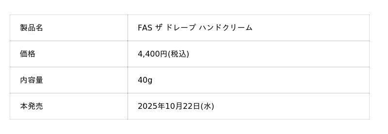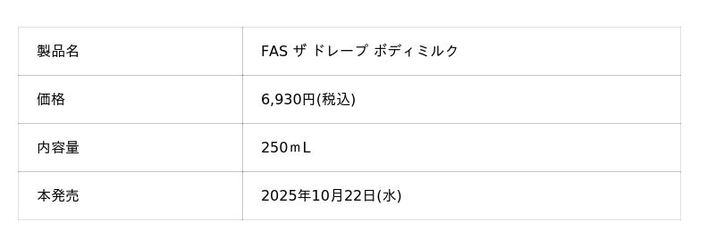 本イベントでは、2025年10月22日(水)に発売となる「FAS」初のボディケアアイテム「FAS ザ ドレープ ボディミルク」と「FAS ザ ドレープ ハンドクリーム」を、本発売に先立ちいち早くお買い求めいただけます。また、同期間中はHANKYU BEAUTY ONLINEでも先行販売をおこなっております。
