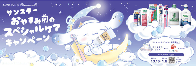 サンスターグループ(以下サンスター)は、夜の自分時間を活用した丁寧なオーラルケア習慣を提案する「おやすみ前のスペシャルケアキャンペーン」を2025年10月15日(水)~2026年1月8日(木)の期間で実施します。期間中に対象のオーラルケア製品をご購入いただくと、株式会社サンリオの人気キャラクター「シナモロール」とコラボレーションしたオリジナルグッズや、「えらべるPay(R)」※1が抽選で当たります。