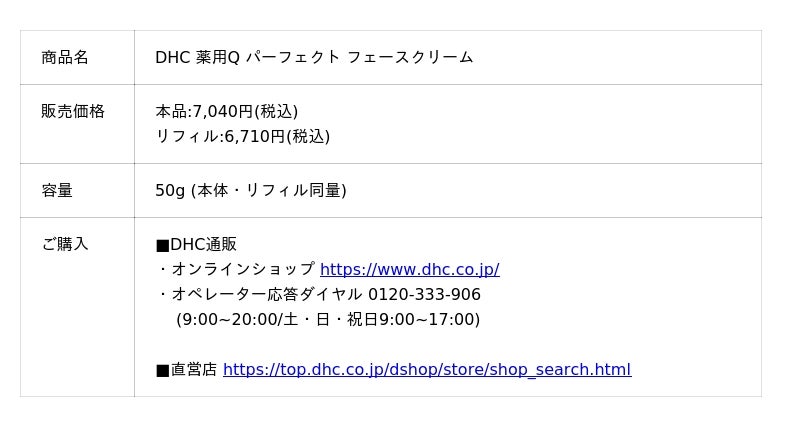 「DHC 薬用Q パーフェクト フェースクリーム」は、ハリ・弾力、うるおいに加え、シワ改善、美白※5、肌荒れ防止の機能まで備えたシリーズ最高峰※1の全方位※2エイジングケア※3クリームです。シリーズ共通配合である「コエンザイムQ10※4」は、従来シリーズの2倍濃度を実現しDHC史上最高濃度の<0.6%>を配合しました。また、薬用成分“ナイアシンアミド”を配合することでシリーズ初のシワ改善機能を搭載し、年齢肌のあらゆる悩みに全方位※2からアプローチします。