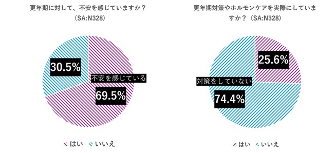 調査から、約7割(69.5%)の女性が不安を感じる一方で、約3割(25.6%)が更年期ケアについて「実施していない」と回答しており、多くの人が「更年期」ケアができてない状況がわかりました。