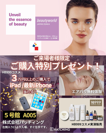 イベント名: ビューティーワールド ジャパン 大阪 開催日: 2025年10月20日(月)~22日(水) 会場: インテックス大阪 共同出展: ソフトバンク株式会社 × 株式会社ハッチィング 主な展示・体験内容: iPadを活用したサロン業務のデジタル化レクチャー 通信×美容の新サービス紹介 美容機器「Air Bali」・化粧品「HB999」シリーズ体験展示