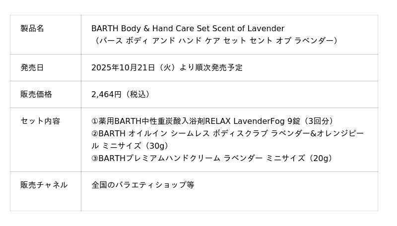 バスタイムからスリープタイムまでワンランク上のナイトルーティンを提案するナイトウェルネスブランド「BARTH(バース)」は、おやすみ前のリラックスタイムをやさしいラベンダーの香りで包む限定セット「BARTH Body & Hand Care Set Scent of Lavender(バース ボディ アンド ハンド ケア セット セント オブ ラベンダー)」を、2025年10月21日(火)より全国のバラエティショップ等で順次発売します。