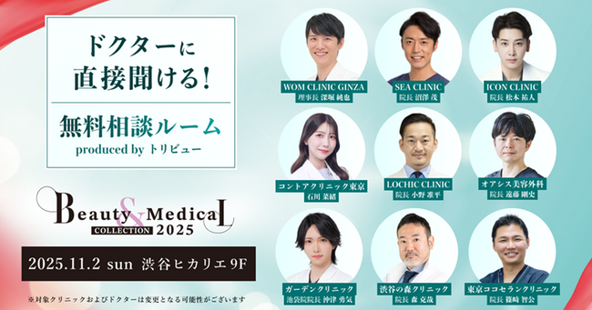 Beauty & Medical Collection運営事務局(以下、BMC事務局)は、2025年11月2日(日)に渋谷ヒカリエ(ヒカリエホール)で開催する、日本最大級の美容医療イベント「Beauty & Medical Collection 2025」において、トップドクターたちによる無料相談企画『ドクターに直接聞ける! 無料相談ルーム』を実施いたします。このたび、参加クリニックおよびドクターが決定したことをお知らせいたします。