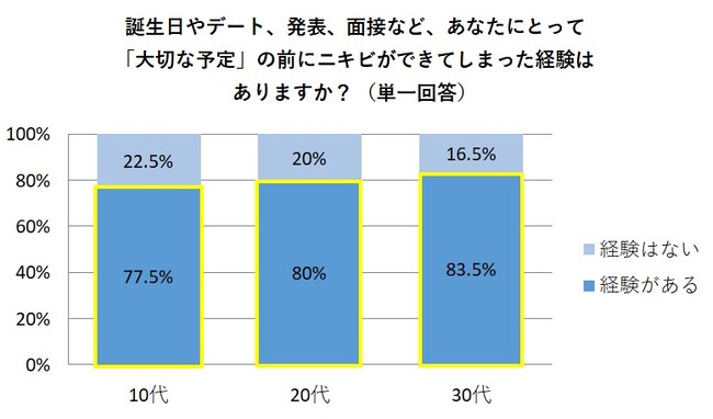 「誕生日やデート、発表、面接など、あなたにとって『大切な予定』の前にニキビができてしまった経験はありますか?」と聞いたところ、10代は77.5%、20代は80%、30代は83.5%の割合で「経験がある」と回答。(グラフ4.)具体的な対処法のエピソードとして、「コンシーラーやファンデーションでなんとか隠した(10代)」「花粉症と嘘をついてマスクを付けた(20代)」「メイクを濃くして、写真撮ったときもめちゃくちゃ加工した(30代)」などの応急処置があげられたほか、「デートに集中できなかった(10代)」「集合写真で欠席(20代)」「ニキビできて萎えたから予定をキャンセルした(30代)」などイベント自体に支障をきたすような体験談もあげられました。