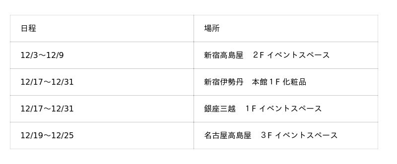 下記の店舗にて期間限定プロモーションを実施いたします。イベント開催店舗だけの特別なギフトもご用意しております。香りとともに、心ときめくひとときをお楽しみください。
