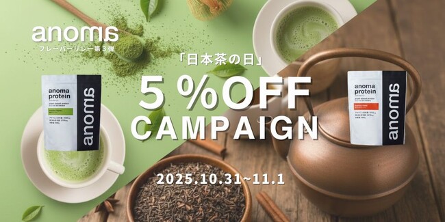 エンドウ豆を主原料とした100%植物性プロテイン「anoma(アノマ)」(本社:東京都新宿区、代表取締役社長:荒井 俊亮)は、2025年10月31日(金)の「日本茶の日」を記念し、公式オンラインストアにて「anomaプロテイン 抹茶フレーバー」および「anomaプロテイン ほうじ茶フレーバー」を10月31日、11月1日の2日限定で5%OFFにてご提供するキャンペーンを実施いたします。