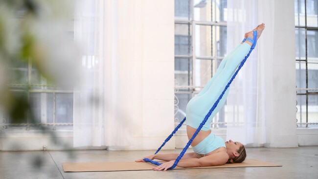 コネクションバンドを使用してのマットピラティスのロールオーバー。手足にコネクションズバンドを装着することで、全身のつながりをより感じることができる特徴がある。