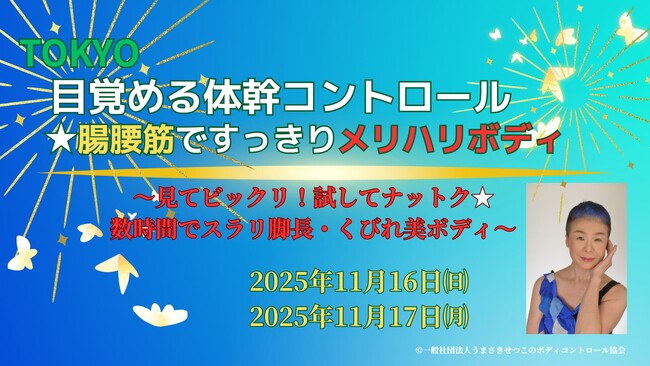 体幹を意識するボディワークで健康美を実現する、一般社団法人うまさきせつこのボディコントロール協会(以下UBCA、本社:東京都中央区、代表理事:馬崎節子)は、2025年11月16日(日)および17日(月)の2日間にわたり、東京・目黒区にて「ボディコントロール東京ワークショップ」を開催いたします。