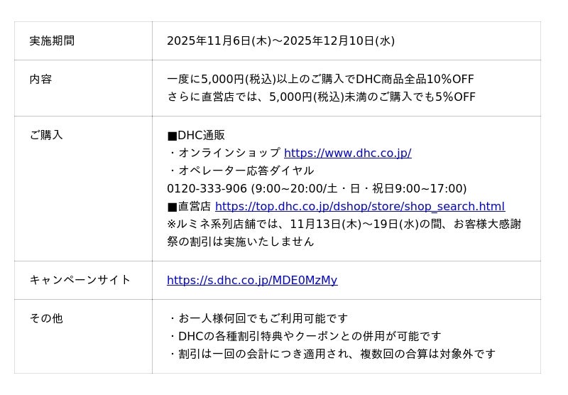 期間中、DHC通販および全国の直営店にて、一度に5,000円(税込)以上お買い上げいただいたお客様を対象に、DHC商品を<全品10%OFF>でご提供します。