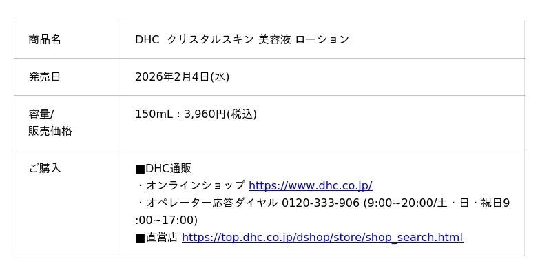 株式会社ディーエイチシー(本社:東京都港区、代表取締役社長:宮崎緑、以下:DHC)は、当社を代表する<オリーブウェルシリーズ>から、「DHC クリスタルスキン 美容液 ローション」を2026年2月4日(水)に新発売いたします。1本で化粧水と美容液の2役を担うDHC初の“セラムインローション”で、角層すみずみまで水分と油分をいきわたらせ、ふっくらとしたツヤ肌へ導きます。
