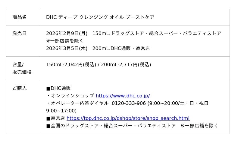 株式会社ディーエイチシー(本社:東京都港区、代表取締役社長:宮崎緑、以下:DHC)は、累計売上1.2億個※1を突破した「ディープクレンジングシリーズ」から、スキンケアが浸透しやすい肌環境に整える「DHC ディープ クレンジング オイル ブーストケア」を2026年2月9日(月)から順次発売いたします。シリーズ共通のメークや毛穴汚れを落とす洗浄力はそのままに、“新発想”のスキンケアをなじみやすくするブースター機能※2と洗顔機能を追加し、角層をやわらげ、キメを整えることで「ツヤうるおい肌」へ導くクレンジングオイルです。