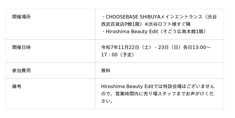 ・実店舗&ECショップ 渋谷西武百貨店CHOOSEBASE SHIBUYA&広島そごうHiroshima Beauty Edit https://choosebase.jp/collections/umehadaodoru