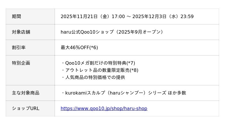 発売から12年、多くの方に支持され続けているリンス不要のオールインワンシャンプー「kurokamiスカルプ(haruシャンプー)」は、2025年10月にシリーズ累計出荷本数が800万本(*3)を突破いたしました。今回のメガ割では、haruの魅力をより幅広い層の方に知っていただきたいという思いから、最大46%OFFの特別価格(*4)に加え、Qoo10限定特典やアウトレット品など、豊富なラインアップをご用意しました。『Qoo10メガ割』を通じて、より多くのお客様に、haruのヘッドビューティ(*5)を体感いただける機会をお届けいたします。