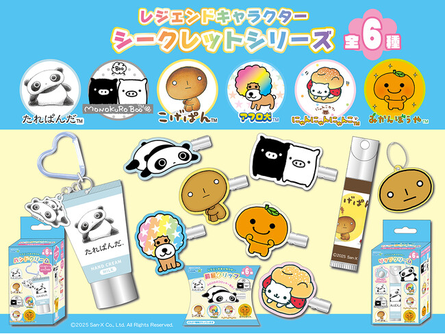 新商品は、2000年前後に一世を風靡した『レジェンドキャラクター』をモチーフにしたコスメ&雑貨です。ラインナッ プは、ラバーミラーマスコット付きリップクリーム・アクリルチャーム付きハンドクリーム・フロッキー前髪クリップの 全3アイテム。それぞれ「たれぱんだ」「こげぱん」「アフロ犬」「モノクロブー」「にゃんにゃんにゃんこ」「みかん ぼうや」の全6キャラクターのうち、いずれか1つが当たるブラインド仕様になっています。かわいらしさと実用性を兼ね備えた、懐かしさを感じるキャラクターたちが揃ったシリーズです。