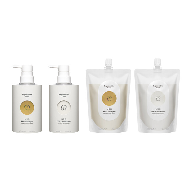 ダメージシャンプーとの違いは、“補修力の次元”。ukaが着目したのは、髪の中の結合(ボンド)です。毛髪補修成分である反応型ケラチン加水分解ケラチン(羊毛)を中心に、ダメージホールを埋め、毛髪内部の3次元構造を補修します。ファイバーハンス、トステア、レブリン酸といった再結合型成分が連動し、熱(ドライヤーやアイロン)を味方にして、髪の内部を補修。ノンシリコンでありながらサロン級の潤いと補修を両立ししなやかで、芯のある髪へと導きます。300mLのスパウト(蓋)付きのリフィルも同時に発売、環境にもやさしく、本体より約12%お得です。IZUシリーズ共通パッケージで新たにボトル購入の必要がなく、既存ラインからの移行もスムーズ。