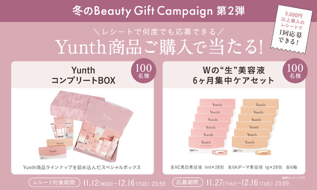 本キャンペーンは、2025年11月12日(水)10:00以降にYunthアイテムを5,000円(税込)以上ご購入いただいたレシートでご応募いただけるマストバイ企画です。抽選で200名様に、Yunthの主要アイテムをほぼすべて詰め込んだ〈YunthコンプリートBOX〉、または「生VC美白美容液」「生VAダーマ美容液」をそれぞれ6箱ずつセットにした〈Wの“生”美容液 6ヶ月集中ケアセット〉をプレゼント。Yunthの魅力を存分に体感できるギフトとなっております。いずれの賞品にも、日常使いに便利なYunthオリジナルトートバッグをセットでお届けします。