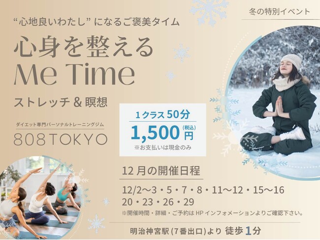 【冬の特別イベント】呼吸を整え・身体を整え・心を整える。”ストレッチ&瞑想” で ~心身を整えるMe Time~開催!!|表参道・ダイエット専門パーソナルトレーニングジム808TOKYO