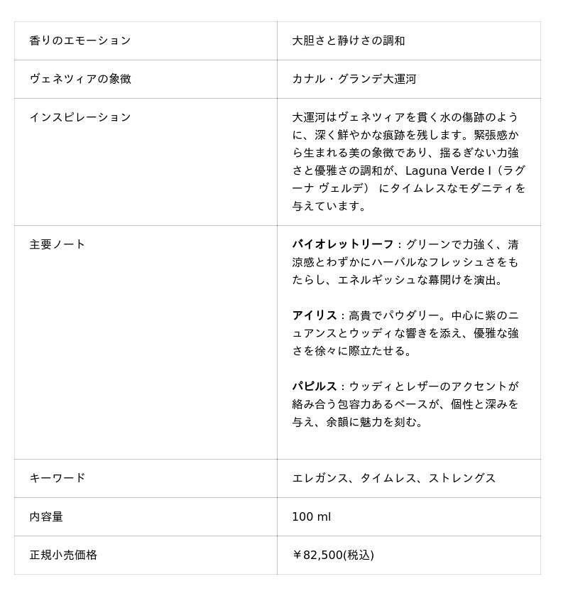 “この新たな香りの創作によって、私はあなたを、ヴェネツィアの象徴ともいえるカナル・グランデ大運河をそっと漂うような旅へとお誘いします。都市に刻まれた象徴的な傷跡のように、この水路は街を二分しながらも、その青磁色の印象的な美しさによって都市の魅力を際立たせています。この魅惑的な水辺には壮麗な宮殿が立ち並び、ヴェネツィアという都市が持つ格式と栄華の歴史を静かに物語っています。私は、この力強くも神秘的な水の存在感を、フローラル ウッディ アロマティックの香調を纏うエクストレ・ド・パルファム*へと託しました。調香界で名高い原料を用い、潟の清らかさ、落ち着きと優雅さ、そして思わず心を惹きつけられるような静かな魅力を香りに込めています。”