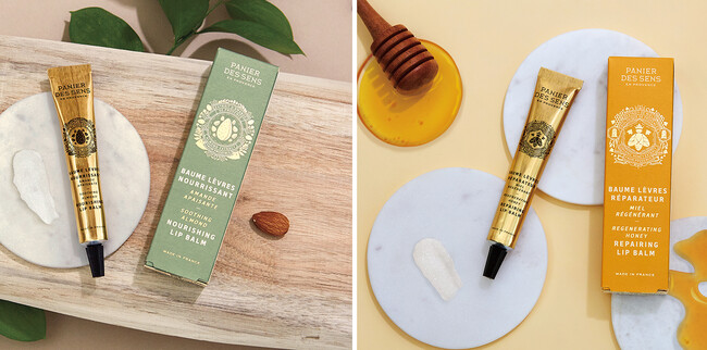 『パニエデサンス』より、プロバンスのたっぷりの陽光に包まれて育ったアーモンドを贅沢に使った「アーモンドコレクション」と、プロバンス産のオーガニックハチミツを使った「ハニーコレクション」のリップバーム