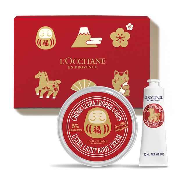 保湿の王様と呼ばれるほど高い保湿効果を誇る「シアバター」を20%配合し、過酷な冬の乾燥から手肌をうるおいで満たす「シア ハンドクリーム」。ブランドを代表するアイコン製品であり、自分のケアにはもちろん、ギフトにも喜ばれています。この「シア ハンドクリーム」と、すっと肌になじみしっかり保湿する淡雪のようなテクスチャーが特徴の「スノーシア ボディクリーム」を、干支の午や招き猫など、福を招く縁起モチーフの華やかな限定デザインであしらい、ギフトボックスにセットしました。新春のご挨拶や、大切な方へのギフトにもおすすめです。