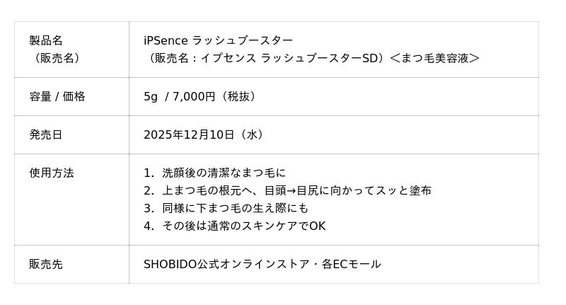 化粧品、化粧雑貨、服飾雑貨及びキャラクター雑貨等の企画・製造・販売、コンタクトレンズの企画・販売を行う粧美堂株式会社(本社:東京都港区、代表取締役社長:寺田正秀、以下 粧美堂)は、再生医療や細胞研究を応用した独自アプローチ“iPS美容”*¹を採用した新ブランド 「iPSence(イプセンス)」 をローンチし、第1弾としてまつ毛美容液 『iPSence ラッシュブースター』 を2025年12月10日(水)より公式オンラインストアおよび各ECモールにて発売いたします。