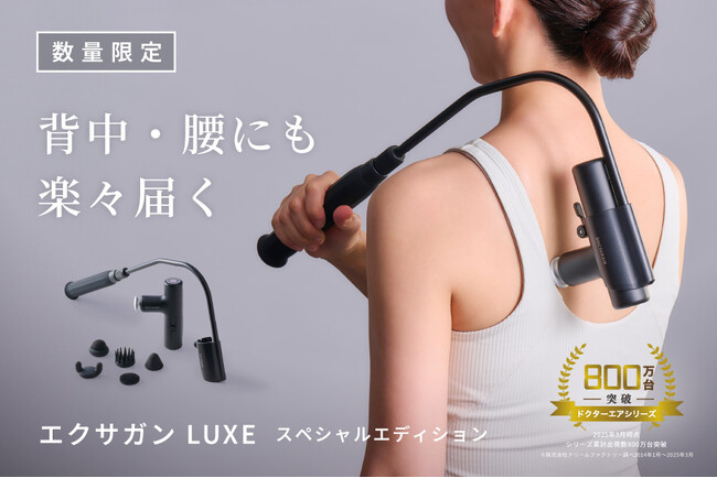 株式会社ドリームファクトリー(本社:大阪府大阪市、代表取締役:鳥井若太郎)が展開する、全国約4,000店舗で取り扱われているトータルボディケアブランド『ドクターエア』は、人気のハンディガンシリーズ「エクサガン LUXE」の最新モデルとして、背中まで届くバックアームがセットになった、スペシャルエディションを2025年12月10日より数量限定で発売いたします。オンラインでは12月12日から販売開始予定です。