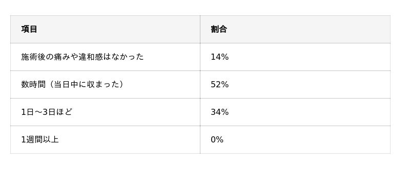 ダウンタイムに関しては、1週間以上続いたという回答は見られませんでした。