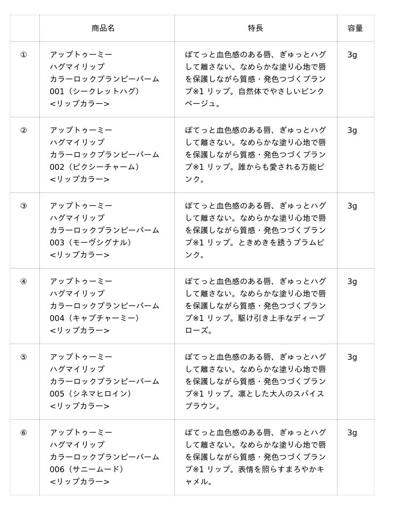 コーセーコスメポート株式会社(本社:東京都中央区、代表取締役社長:小林 孝雄)は、メイクアップブランド『アップトゥーミー』より、色移りしないジェル膜処方のぽってりプランプ※1 リップカラー「ハグマイリップ カラー ロックプランピーバーム」(1 品目 6 品種、ノープリントプライス)を 2026 年 3 月 19 日より全国の量販店・ドラッ グストアを中心に順次発売*します。