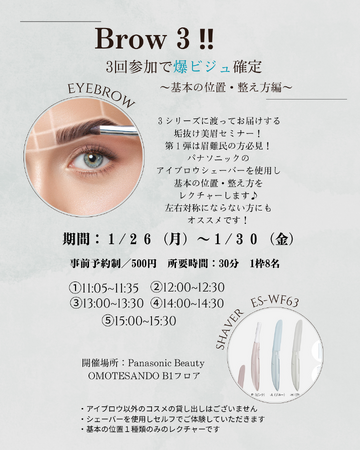 2025年1月26日(月)~1月30日(金)の5日間、眉の基本をマンツーマン感覚で学べる垢抜け美眉セミナー「Brow 3!!」(全3回開催)の第1弾として『基本の位置・整え方編』を開催いたします。