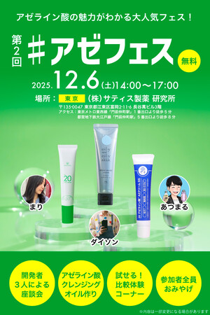 株式会社スクアス(本社:愛知県春日井市 代表取締役:久瀬麻里)は、ブライトデイズ、oily and oily skinのアゼライン酸クリームを開発した3ブランドオーナーで第2回『アゼフェス』(アゼライン酸の魅力を伝えるフェス)を、2025年12月6日(土)に東京・株式会社サティス製薬の研究所で開催しました。