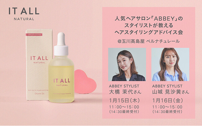 【1月15,16日】人気ヘアサロンABBEYスタイリストのヘアスタイリングアドバイス会。天然由来99.99%マルチユースな『IT ALL NATURAL Charm Oil』で‟こなれヘア”を実現!