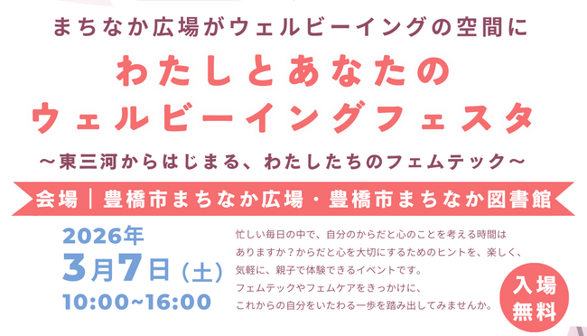 2026年3月7日(土)に豊橋市まちなか広場にて、「わたしとあなたのウェルビーイングフェスタ ~東三河からはじまる、わたしたちのフェムテック~」を開催します。