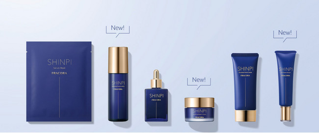 左から、FRACORA SHINPI(R) セラムマスク、FRACORA SHINPI(R) アドバンスト セラムローション、 FRACORA SHINPI(R)、FRACORA SHINPI(R) バイタライジング リペアクリーム、FRACORA SHINPI(R)エンリッチ モイストクリーム、FRACORA SHINPI(R) UVプロテクトセラム