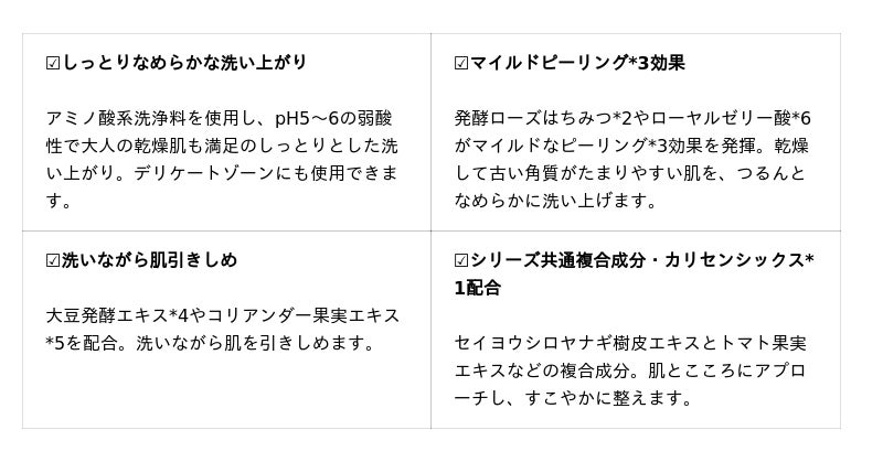 発酵ローズはちみつ*2や植物エキスによるマイルドピーリング*3効果で、つるんとキメの整った、透明感あふれる肌へ。