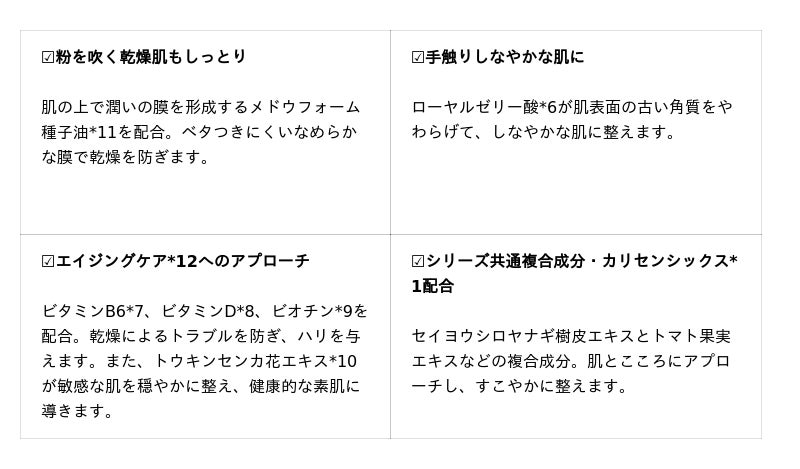 ビタミンB6*7とビタミンD*8、ビオチン*9、トウキンセンカ花エキス*10を配合し、乾燥によるトラブルを防いで豊かなハリと透明感を与えます。