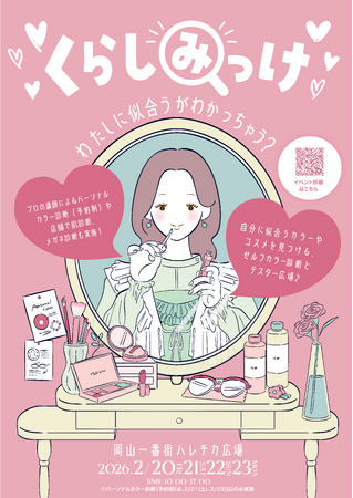 岡山駅直結のショッピングセンター「岡山一番街・さんすて岡山」を運営する山陽SC開発株式会社は、2026年2月20日(金)~2月23日(月・祝)の期間中、岡山一番街 ハレチカ広場におきまして「くらしみっけ~わたしに似合うがわかっちゃう?~」を開催いたします。