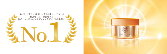 2020年9月の発売以来、ご好評いただいている「パーフェクトワン 薬用リンクルストレッチジェル」は、1品で7役(化粧水、乳液、美容液、クリーム、パック、化粧下地、ネッククリーム)の機能を持ち、日本で唯一※2、2種の有効成分を配合し、シワ改善と美白※3、肌荒れ予防ができる薬用オールインワン美容液ジェルです。この度、国内コスメ(スキンケア・メイクアップ)市場において、2024年11月~2025年10月累計売上No.1※1を獲得いたしました。