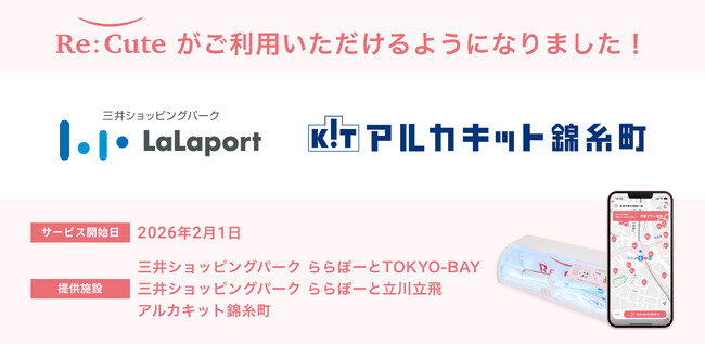 株式会社ReCute(本社:東京都港区、代表取締役CEO:山下 萌々夏、以下、ReCute)は、三井不動産商業マネジメント株式会社(本社:東京都中央区、代表取締役社長:大林 修)が運営する「三井ショッピングパーク ららぽーとTOKYO-BAY」「三井ショッピングパーク ららぽーと立川立飛」「アルカキット錦糸町」に、2026年2月1日、ヘアアイロンのレンタルスポット『ReCute』を新たに設置いたします。