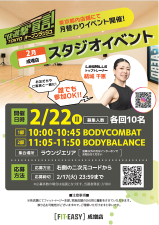 本キャンペーンの一環で、今回2/22(日)にFIT-EASY成増店にて、ニュージーランド発祥の世界的なグループフィットネスプログラム「Les Mills」のトップトレーナー・結城千恵氏を招いた特別レッスン「BODYCOMBAT」「BODYBALANCE」を開催します。