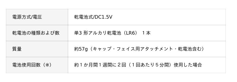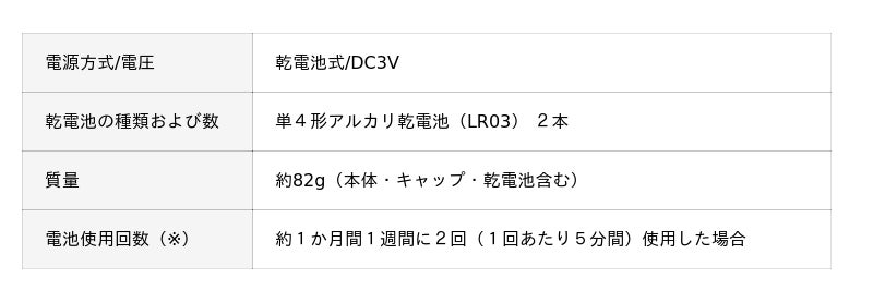 ※電池使用回数について、いずれも毛の濃さ、肌にあてる力、お手入れのしかた、周囲温度などの使用条件によって、使用回数が少なくなることがあります。