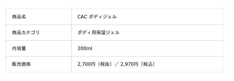 株式会社CAC(本社:千葉県流山市、代表取締役社長:笹田 幸司、以下CAC)は、全身にたっぷり使えるボトルタイプの高保湿ジェル『CAC ボディジェル』(200ml/2,700円[税抜]、2,970円[税込]を、2026年3月11日からCAC正規販売店とCAC公式オンラインショップ、CAC注文センターにて発売いたします。