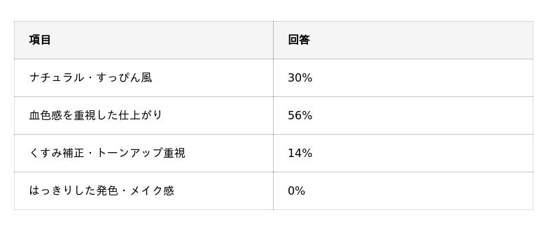 次いで「ナチュラル・すっぴん風」が30%となり、この2項目で全体の86%を占める結果となりました。