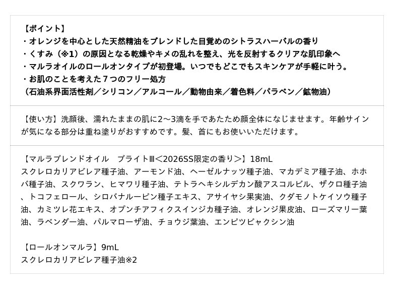 ブライトニングコフレ2026の内容は、マルラブレンドオイル ブライトIII<2026SS限定の香り>、マルラオイル(ロールオンタイプ)の2点セット。