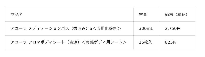 アユーラは、長年培ってきた、心地よさをもたらす香り設計の知見を活かし、これまでも香りによる涼感表現に取り組んできました。今年の「青いAYURA」は、香りによる涼感の表現に加え、実際の使用感でも“ひんやり”とした心地よさを感じられる2品をご用意し、夏のからだと心を整える、「涼」の体験を提案いたします。