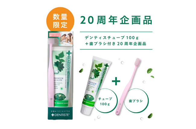 今回発売する20周年記念企画品は、毎日のオーラルケアの基本に立ち返り、歯みがき粉と歯ブラシをセットにした特別仕様です。歯ブラシ付きで通常のチューブタイプと同価格でお求めいただけるお得な内容で、長年『デンティス』をご愛用いただいている方はもちろん、ブランドを初めて手に取る方にもおすすめです。