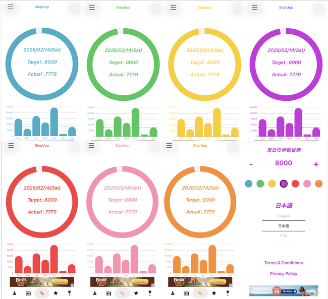 [StepUppメイン画面+目標設定画面] その日の気分で7色のカラーを選択出来る