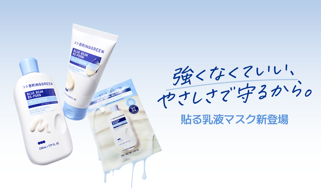 韓国を代表するKビューティープラットフォーム「オリーブヤング」発のヴィーガンスキンケアブランド「BRINGGREEN(ブリングリーン)」は、2026年2月27日(金)スタートのメガ割にて「ブルービーンB5-PDRN(TM)︎*¹ライン」の新商品“貼る乳液マスク”を発売いたします。さらにブランドアンバサダー・ALPHA DRIVE ONEの初・日本向け企画セットや、今年1月に韓国で発売し多くの反響があった、メンバーのビジュアル入りパッケージのシートマスクも数量限定で発売いたします。