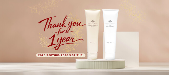 2025年2月に発売の「ダマイ セルリファーム クレンジングジェリー&2in1 フェイスウォッシュ」は、このたび発売1周年を迎えました。日頃のご愛顧への感謝の気持ちを込めて、キャンペーンを実施します。