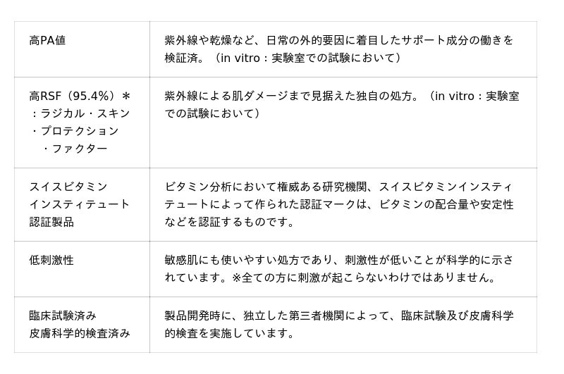 紫外線による酸化ストレスやダメージに総合的にアプローチしながら、肌への負担を考慮した設計となっています。